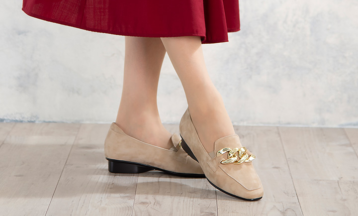 すっきりとしたつま先にこだわったローヒール木型を採用し、シンプルながら上品な印象に仕上げたチェーンローファー。見た目はローヒールでも、実はヒール高3cmの一体型ソールで、歩きやすさとスタイルアップ効果を兼ね備えています。ボリューム感のある樹脂製チェーンをあしらいながらも軽やかなデザインで、ビジネスからカジュアルまで幅広いコーディネートに映える一足です。