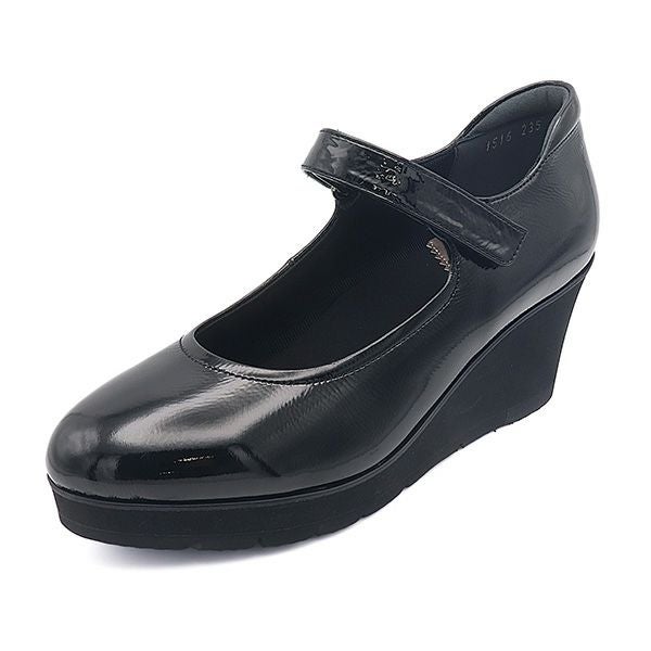 甲が高いため、面ストラップの貼り面が少し出てしましますが歩行に支障はありません。薄手の靴下着用でちょうどよいサイズ感です。ヒール高はありますがウェッジソールのため安定感抜群。皆様お待ちだった待望のエナメル商品の新登場です。