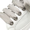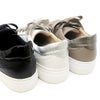 ヒール高・ソール厚みともに3.5cmの厚底フラットスニーカー。キラキラビジューアイレットとリボン紐でフェミニンな印象に仕上げた事でカジュアルすぎず様々な装いに合わせやすいのが嬉しいです。足の一番広い位置(拇趾・小趾付け根)から紐の調整が自在に出来る外羽根方式を採用したデザインは、あらゆる足型におすすめの紐靴です。