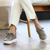 ビジューアイレットとフェミニンなリボン紐がポイントの大人可愛いスニーカー。厚底ソールなのに驚くほど軽く、アッパーサイドを深く覆いソールと縫い合わせる「オパンケ製法」によりしっかりとした作りになっています。