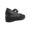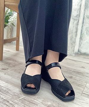 足指を見せずに軽やかさを演出する小さなオープントウがポイント。親指側面に当たる部分にストレッチ性の生地を使用して、外反母趾の方にもより優しい履き心地に。