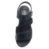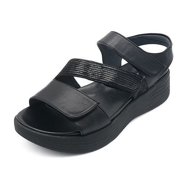 素足にて着用 足長は捨て寸が無い状態ですが、足囲にはかなり余裕がある為、私の場合は3本のベルト全てをきつくし、貼り面を余らせて履く形になります。しかし履き心地はインソールがフットベットの形状で足裏が快適な事と、軽量かつ厚底のソールで足運びも軽やかでストレスがありません。足囲も広く、面ファスナー仕様なのでソックスでも履けます。ワイドパンツなどでモードカジュアルな服装に合わせたいデザインです。