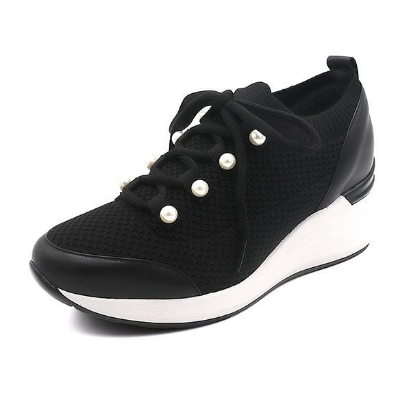 ハイヒールウェッジのきれいめスニーカーを、伸縮性のあるニット素材で仕上げた一足。
