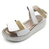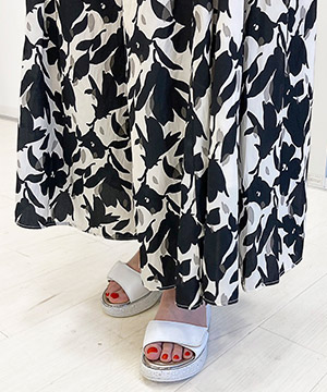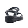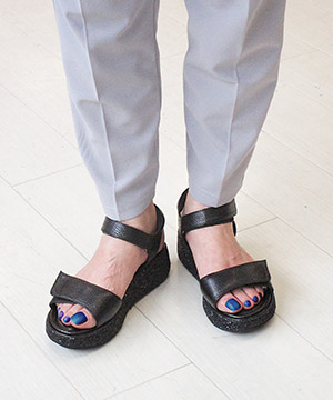 素足での着用でぴったりです。前部分も面ファスナーで調節できるのでゆったり履くこともできます。シンプルなデザインの中に、シボ感のある革とグリッターを巻いたソールがアクセントになっていて