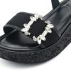 素足での着用でぴったりです。グリッター厚底ベルクロサンダルと違い前部分は調節できませんが、私はこちらの方が足にピッタリ沿うので好みです。ヒールにたっぷり巻いたグリッターと大ぶりなビジューのきらめきに