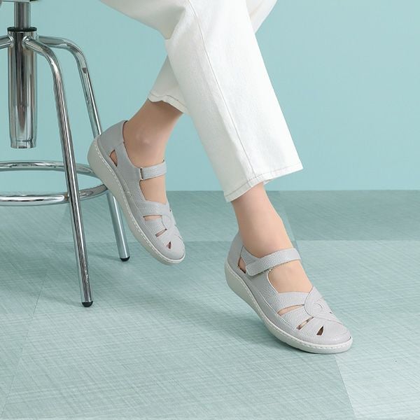 前方がゆったりしていますが、ストラップでしっかり固定されるため歩きやすいです。