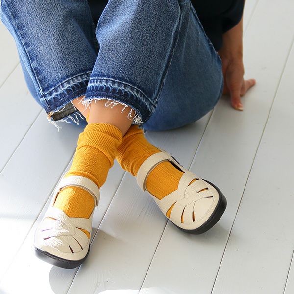 サンダルが苦手な方におススメのサマーシューズ。空きのあるデザインで、涼し気な雰囲気を出しました。ソックスの色や柄を見せてコーディネートを楽しんで。