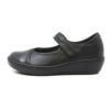 面ファスナーで甲部を調整できるので、ソックスで履いたり、タイツで履いたりしても靴の中で足がすべらず歩きやすいです。巻き爪の私はオブリークトウなのも爪が痛くなりにくく気に入っています。ただ足囲が4E無い方は私の様にサイズを下げるか甲ベルトをきつめに締めた方が良いです。