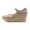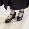 甲が高いため、面ストラップの貼り面が少し出てしましますが歩行に支障はありません。薄手の靴下着用でちょうどよいサイズ感です。ヒール高はありますがウェッジソールのため安定感抜群。皆様お待ちだった待望のエナメル商品の新登場です。