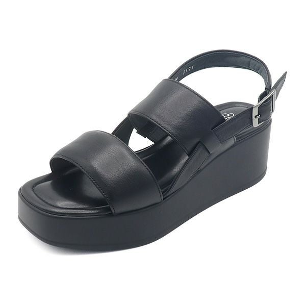 厚底なのに軽量で重さのストレスフリーのシンプルサンダル。足首に近い甲ベルトの内側に隠しゴムを施し、甲高の方でも圧迫が少ないです。シンプルですが、太めの甲ベルト2本でしっかり足をホールドするので、ぐらつきが少ないです。