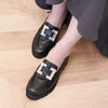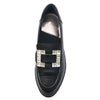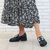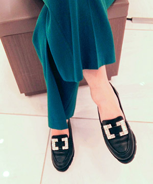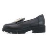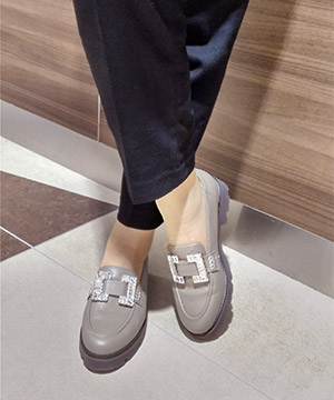 目を惹く大きなビジューと、厚底のタンクソールが特徴のローファー。カカト上クッション入りで足あたりは優しく。