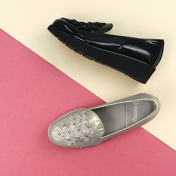 厚底オペラシューズにフラワーモチーフを施したデザイン。いつもの装いをカジュアルダウンしたいけど、フェミニンさも入れたい!そんな方にぴったりの1足です。