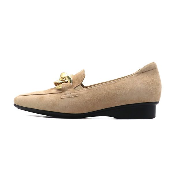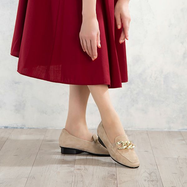 ローヒールですっきりシルエットのチェーン付きソフトローファー。トウラインが細身ですが、足幅ゆったり木型+履き口両サイドにゴムを施してあるので、ゆったりとした履き心地です。トリプルクッションの中敷き機能によって体圧分散するので、ローヒールでも重心が踵に集中せず、ローヒールが苦手な方にもおすすめです。