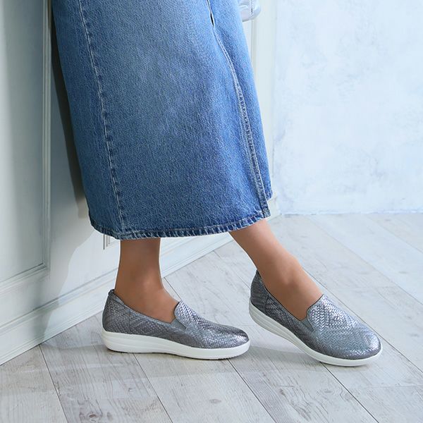 薄手のソックスにて着用。足長にゆとりのある木型の為、ワンサイズ下を薄手のソックスで履いても足囲にゆとりのある履き心地です。足長は250㎜の私の足でぴったりという感じです。ほどよい厚底感と、底の材質のクッション性が心地よいです。スリッポンなのでさっと脱ぎ履き出来る為デイリー使いに活躍しそうです。メッシュグレーを着用しましたが、光沢感と型押しが高級感があり、大人のスニーカーという印象です。