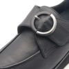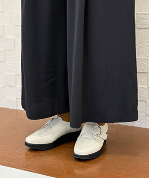 ストッキング着用でちょうどよく履けます。履き慣らしてきたら靴下も履けそうです。モンクストラップといえばトラッドな印象ですが、2色づかいになっているバックルがアクセントになっていて、面ファスナーで着脱できるラクチンさも今っぽいです。バックルは動かすことができるので、着用される方によってはベルトを留めたときのバランスにちょうど良い位置に動かすのがおすすめです。
