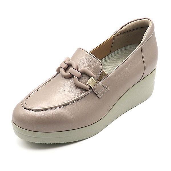 ビューフォートで人気の厚底レースアップと同じソールを使用した、チェーン付きスリッポン。サイドにゴム入りで脱ぎ履きしやすく、足にフィットしてくれます。アッパーと同じカラーの金属製チェーンはマット加工で上品な印象をあたえてくれます。