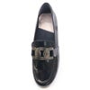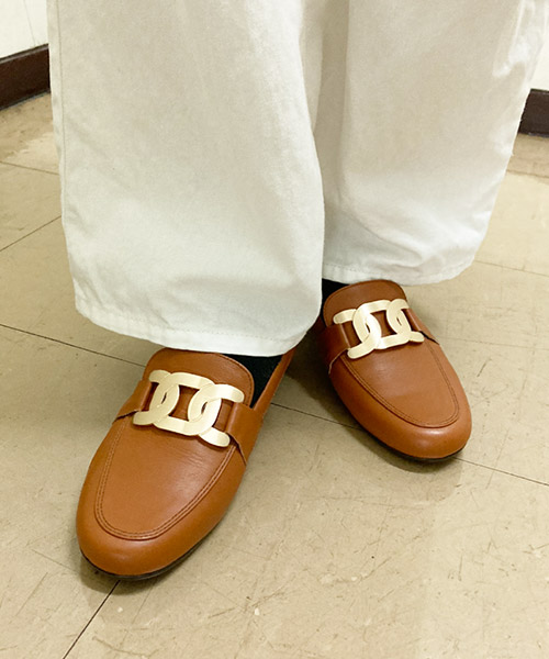 スッキリ細身のシルエットとドライビング風ソール。目を惹くメタルモチーフがコーディネートのアクセントに。