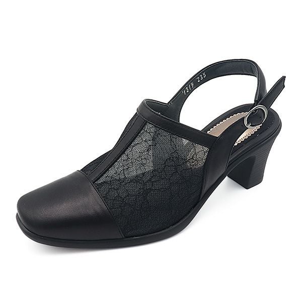 チュールに繊細なレースを貼り合わせた、エレガント映えするバックベルトパンプス。ビューフォートオリジナルの合成ゴム素材で形成した一体型ソールは弾力性があり、前足部のソールの厚みが1cmある事で、趾先付近の足裏への衝撃が少ないです。甲被りが深い為しっかりと足をホールドし、前滑りしにくい工夫がされています。また、チュール素材はとても柔らかい為、外反母趾などへも当たりが優しいです。