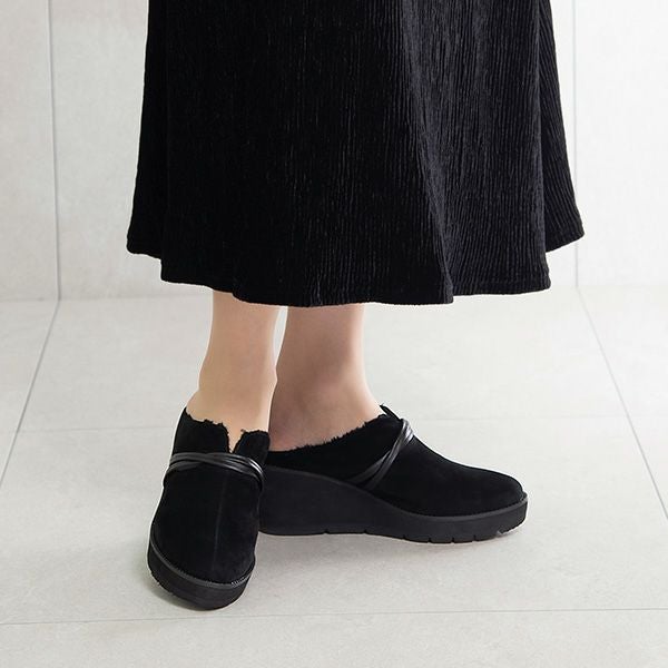 ビューフォートで人気のプラットフォームターバンデザインパンプスと同じソールのミュール。インナーボア仕様であたたかく柔らかな足あたりで履き心地も良いです。アウトソールはラインストーン付きの縁取りでさりげないおしゃれをプラスで足元のワンポイントに。