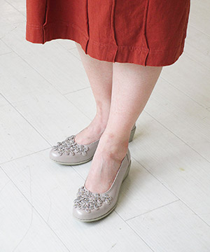ストッキング着用にてよいサイズ感です。履き口周りにゴムが施されているのでフィット感も抜群。ビューフォートらしいキラキラのフラワーモチーフがとても上品でアクセントとなるパンプスです。