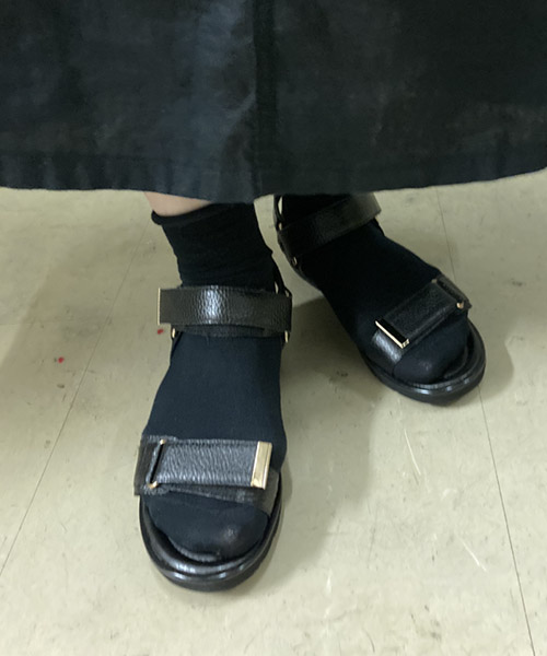 素足にて着用でちょうどよく履けます。他のサンダルのようにかかと部分にスポンジは入っていませんが、ベルトが太めで革も柔らかいので靴擦れはしにくそうです。 前の部分もベルクロで調節できるので、靴下を合わせても履けそう。履き始めからソールの弾力性を感じて、たくさん歩けそうだなと思いました。 金具がアクセントになっているので、カジュアル感ときれいさのバランスがちょうど良く、いろんなコーデに合わせやすそうです。