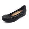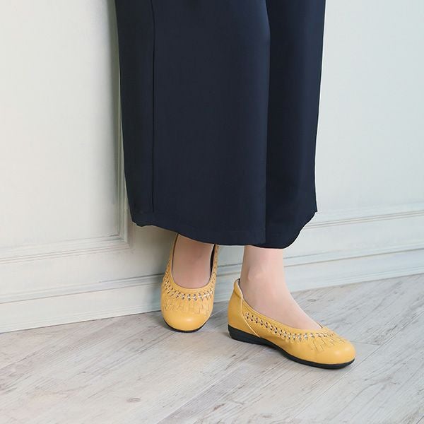 ストッキングにて着用 足長はぴったりですが、甲まわりは4Eワイズなのでゆとりがあります。踵が脱げることはありません。差しメッシュのデザインで空き感があり、軽やかな印象で春夏にぴったりのデザインです。初夏や秋口の季節、またサンダルが苦手な方にぜひお試し頂きたい1足です。ストラップの無いバレエシューズなので、脱ぎ履きも楽でした。