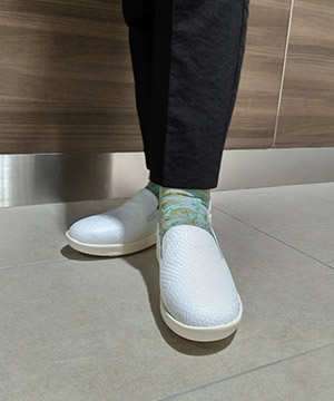 薄手のソックスにて着用。足長にゆとりのある木型の為、ワンサイズ下を薄手のソックスで履いても足囲にゆとりのある履き心地です。足長は250㎜の私の足でぴったりという感じです。ほどよい厚底感と、底の材質のクッション性が心地よいです。スリッポンなのでさっと脱ぎ履き出来る為デイリー使いに活躍しそうです。メッシュグレーを着用しましたが、光沢感と型押しが高級感があり、大人のスニーカーという印象です。