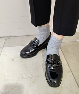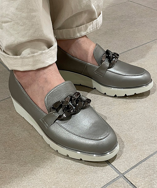 大ぶりなチェーンがインパクトのあるローファーです。自慢のクッションソールにトレンド感の強いデザインで、らくちんにオシャレ上級者に。