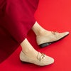 細身のシルエットですが通常サイズでピッタリです。甲部、両サイドにゴムが施されているのでフィット感がよく、ローヒールでもきちんと感を出したい人には特におすすめ。チェーンがアクセントとなって上品な印象に見えるためパンツに合わせるとマニッシュなスタイルに。