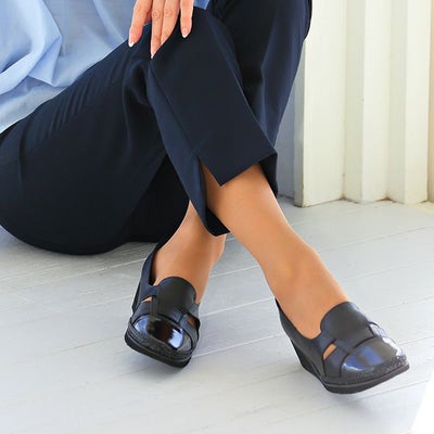 楽で履きやすいです。ストラップのある靴ほど安定してないです。サイズはいつものサイズで大丈夫だと思います。