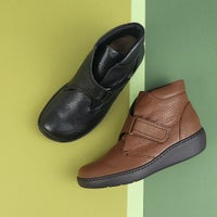 足先の幅が広いため、4Eでもなかなかあう靴がなく、長年ウオノメに悩まされてきました。ですが、この靴の形は足先を圧迫することなく、多分ウオノメはよくなると思います。それでも、足長23.5センチですが、24センチを選んでいます。 実は、1足目は店舗で試着して購入し、2足目を色違いでこちらで購入しました。ところが、2足目は1足目より小さいようで、圧迫を感じます。皮革を伸ばす薬品をスプレーして、馴染むのを待っているところです。 そして、履いていて気づいたのですが、ベルトのベルクロの位置のせいで、足がしっかりと固定できません。そのため、歩くうちに靴の中で足が前にずれて足先が窮屈になるのです。ですから、3足目は24.5㎝を購入するつもりです。